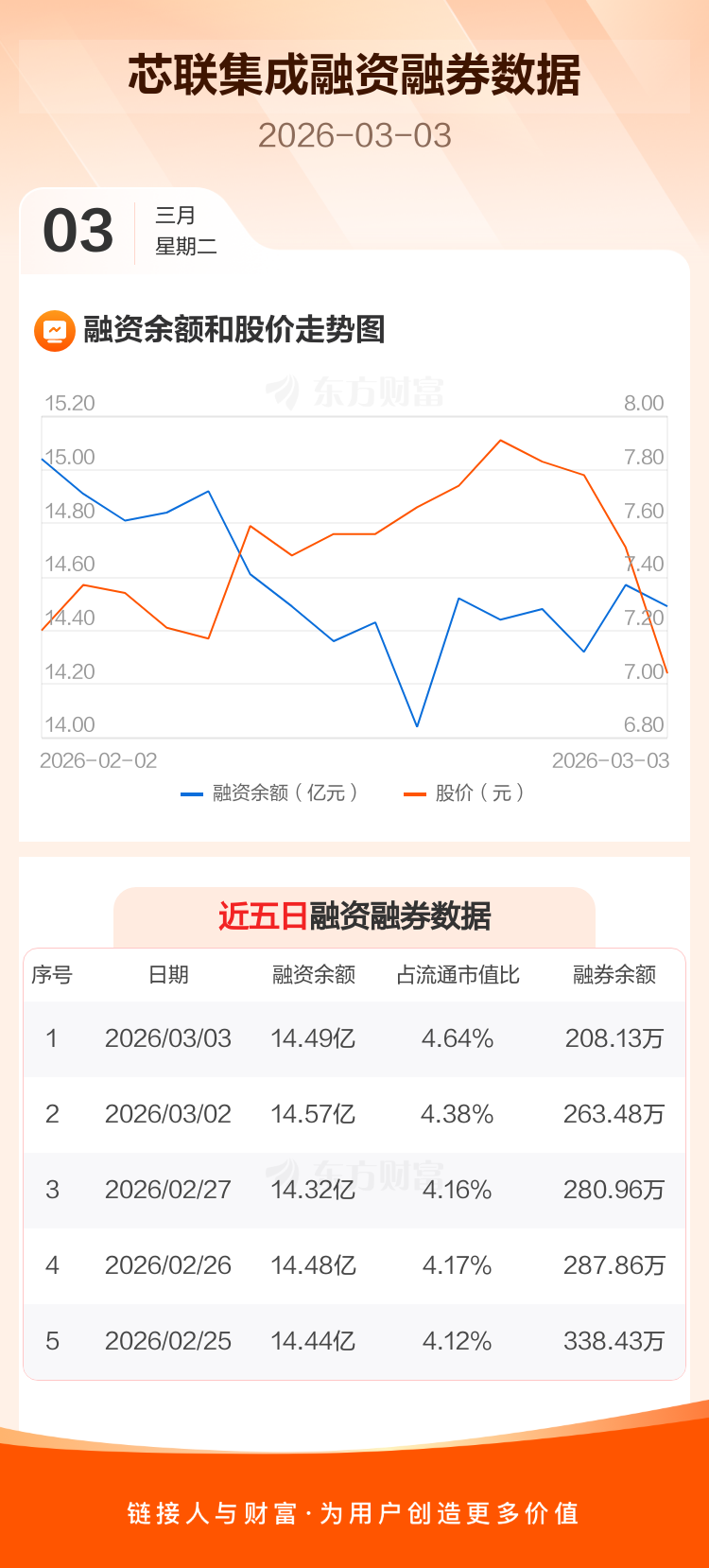 交易所最新数据显示,芯联集成于2026年3月3日获融资买入1.22亿元,融资偿还1.30亿元,当日融资净偿还819.62万元。目前,该股融资余额14.49亿,占流通市值比例为4.64%。