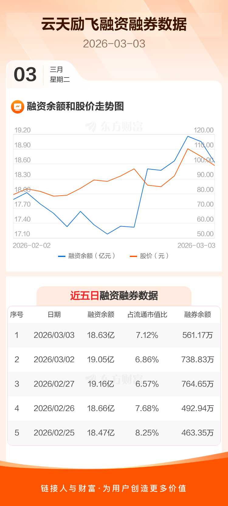 交易所最新数据显示,云天励飞于2026年3月3日获融资买入2.86亿元,融资偿还3.28亿元,当日融资净偿还4207.74万元。目前,该股融资余额18.63亿,占流通市值比例为7.12%。