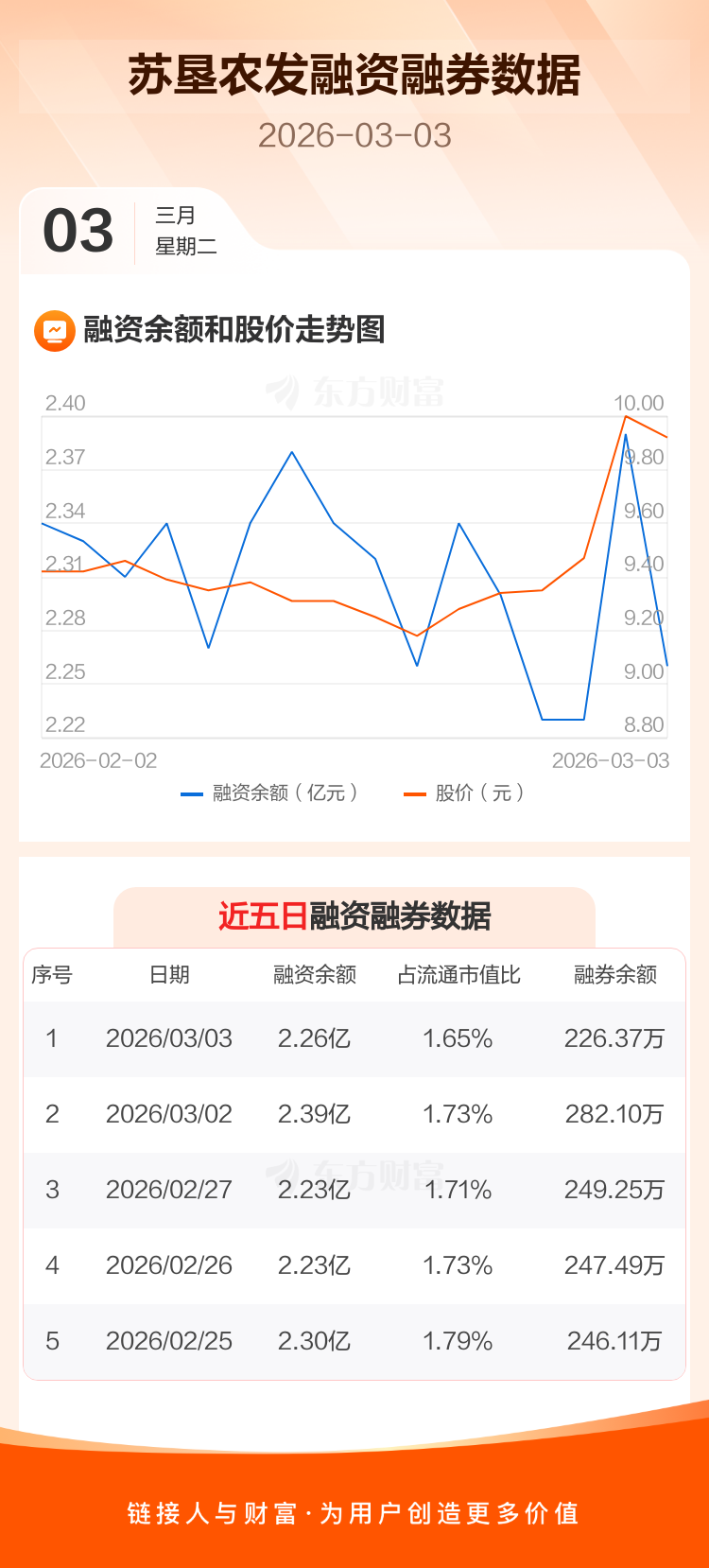 交易所最新数据显示,苏垦农发于2026年3月3日获融资买入3609.20万元,融资偿还4869.50万元,当日融资净偿还1260.3万元。目前,该股融资余额2.26亿,占流通市值比例为1.65%。