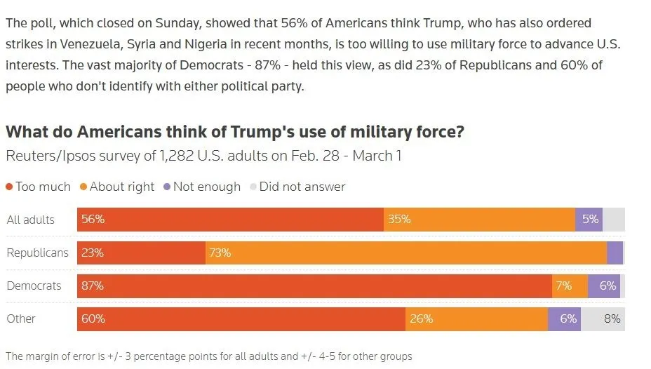 路透社与益普索集团3月1日联合发布的民调也印证了动武难获广泛支持。约九成受访者知晓美国对伊朗发动袭击的消息,但43%明确反对,29%表示不确定,只有27%的受访者表示赞成。