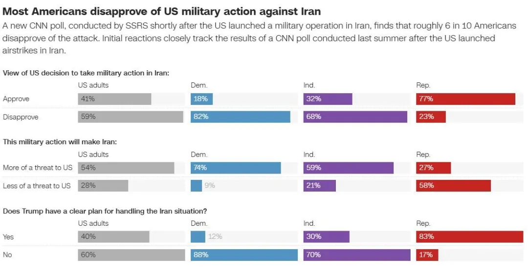 美国和以色列2月28日对伊朗发动军事打击后,美国有线电视新闻网3月2日公布的民调结果,引发广泛关注。