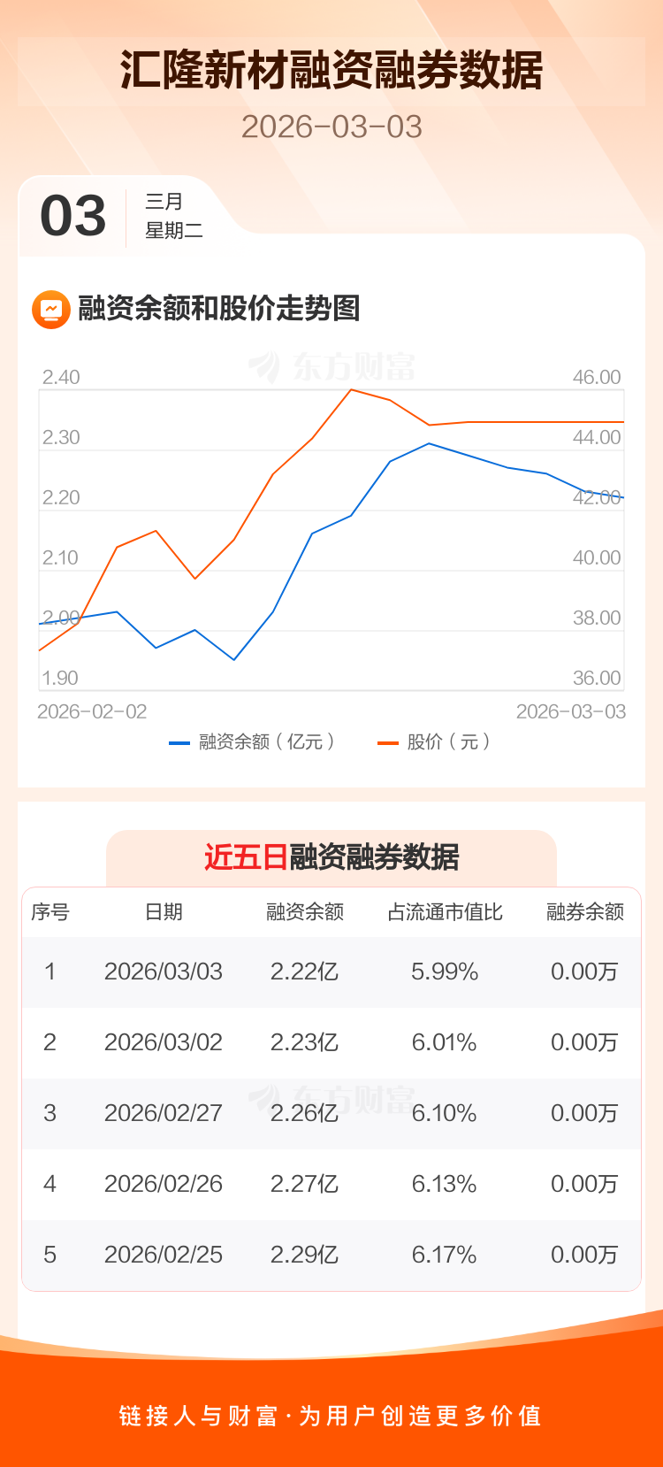 交易所最新数据显示,汇隆新材于2026年3月3日获融资买入0元,融资偿还98.19万元,当日融资净偿还98.19万元。目前,该股融资余额2.22亿,占流通市值比例为5.99%。