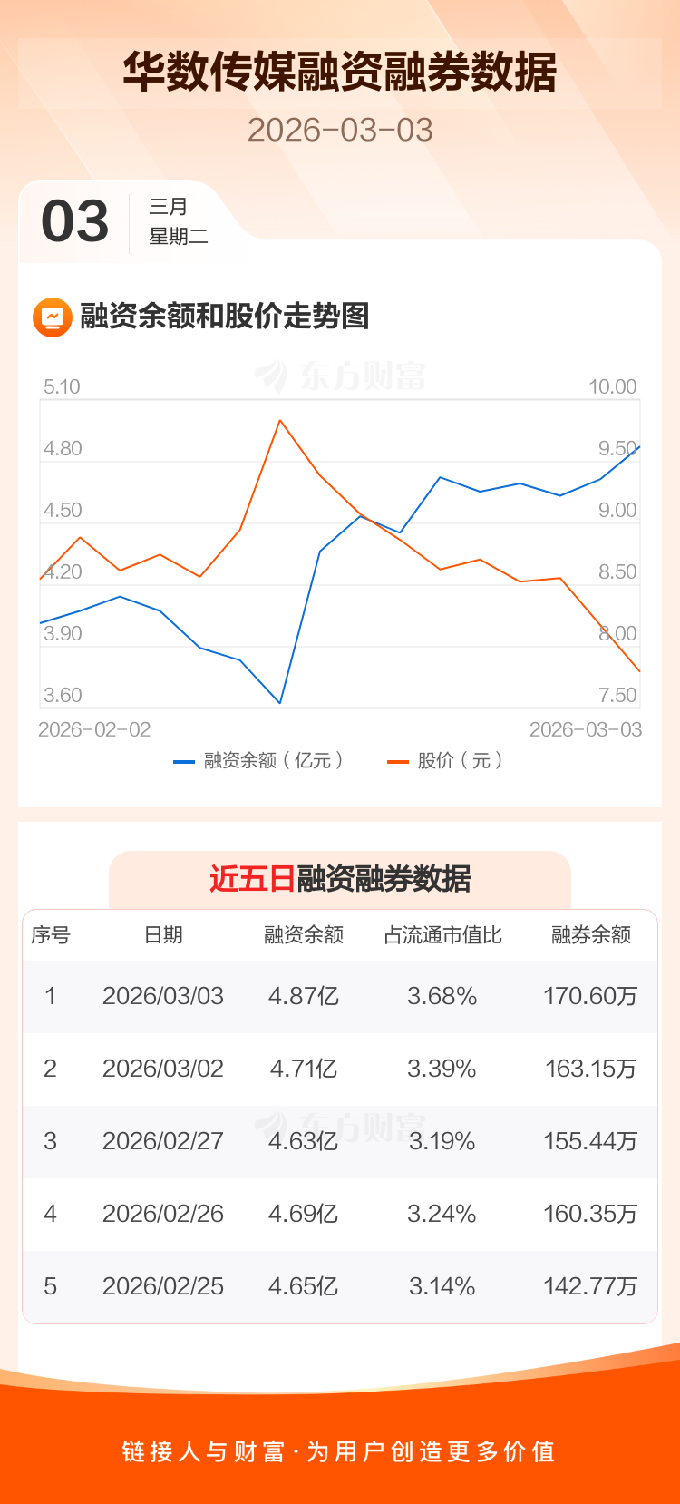 交易所最新数据显示,华数传媒于2026年3月3日获融资买入4749.57万元,融资偿还3167.13万元,当日融资净买入1582.45万元。目前,该股融资余额4.87亿,占流通市值比例为3.68%。