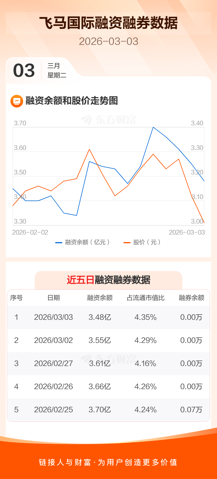 交易所最新数据显示,飞马国际于2026年3月3日获融资买入1250.46万元,融资偿还1981.33万元,当日融资净偿还730.88万元。目前,该股融资余额3.48亿,占流通市值比例为4.35%。