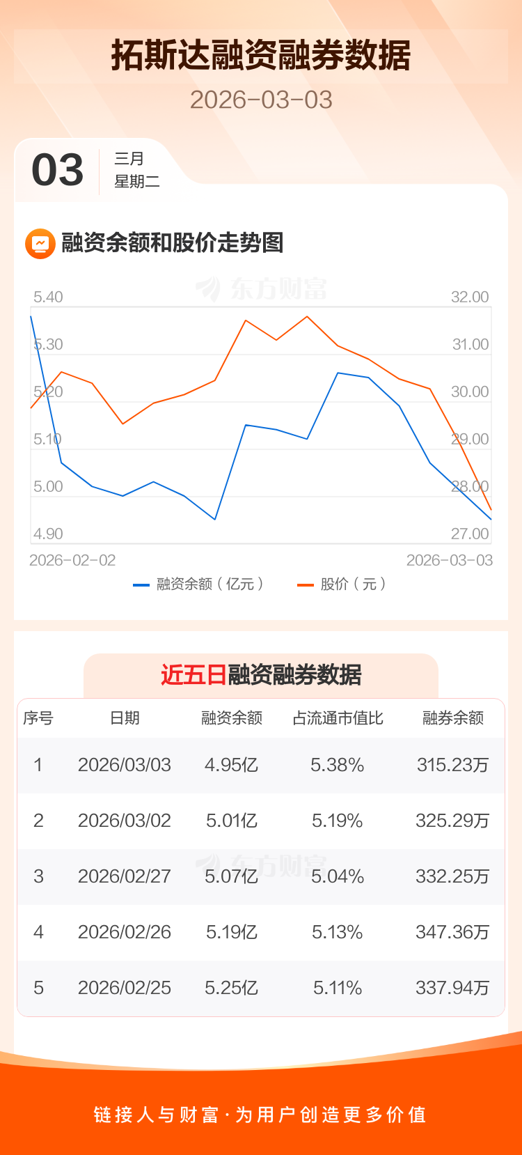 交易所最新数据显示,拓斯达于2026年3月3日获融资买入1998.89万元,融资偿还2649.64万元,当日融资净偿还650.75万元。目前,该股融资余额4.95亿,占流通市值比例为5.38%。