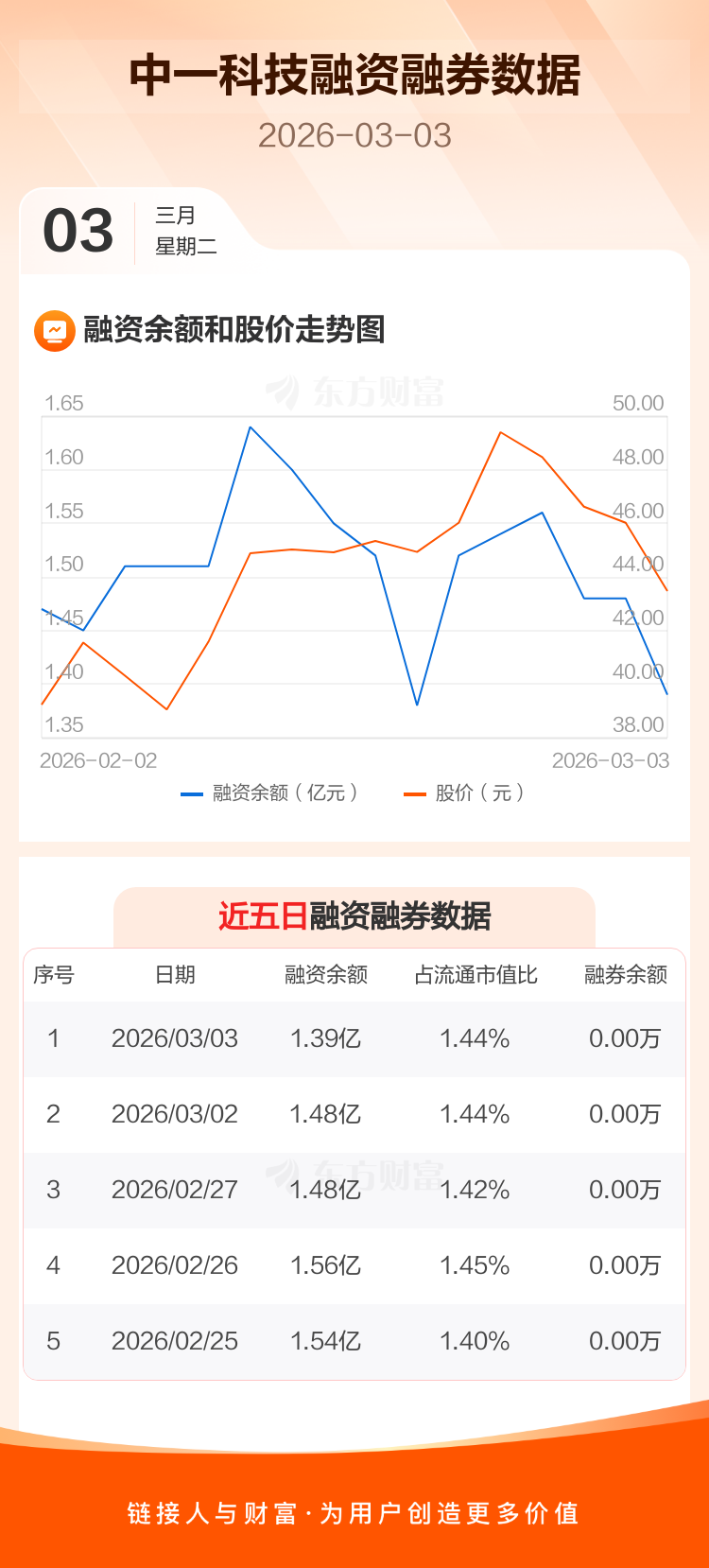 交易所最新数据显示,中一科技于2026年3月3日获融资买入2201.02万元,融资偿还3071.96万元,当日融资净偿还870.94万元。目前,该股融资余额1.39亿,占流通市值比例为1.44%。