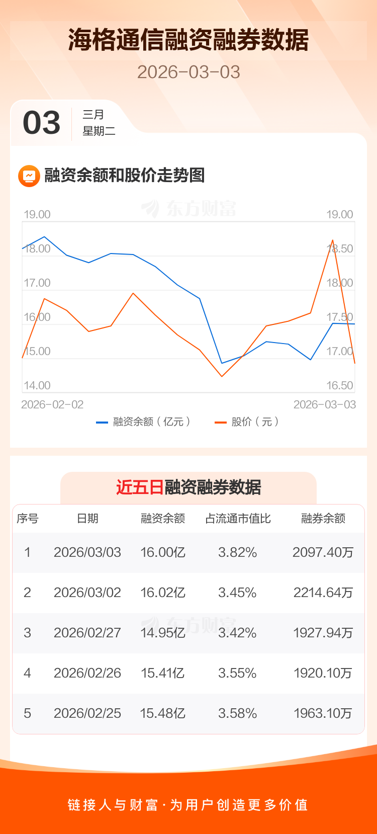 交易所最新数据显示,海格通信于2026年3月3日获融资买入2.89亿元,融资偿还2.90亿元,当日融资净偿还172.71万元。目前,该股融资余额16.00亿,占流通市值比例为3.82%。