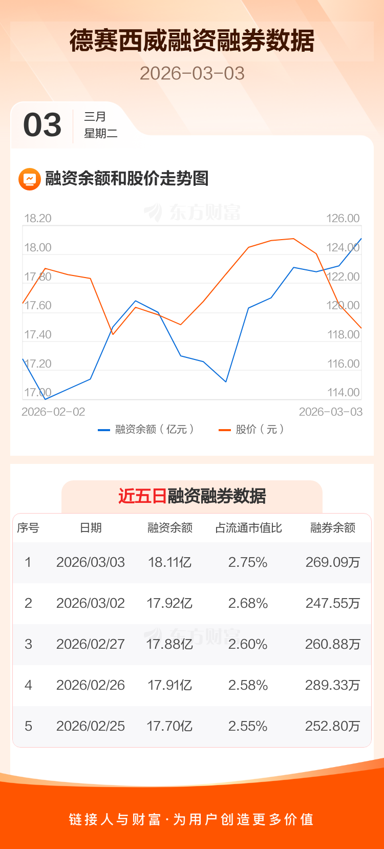 交易所最新数据显示,德赛西威于2026年3月3日获融资买入1.63亿元,融资偿还1.44亿元,当日融资净买入1911.99万元。目前,该股融资余额18.11亿,占流通市值比例为2.75%。