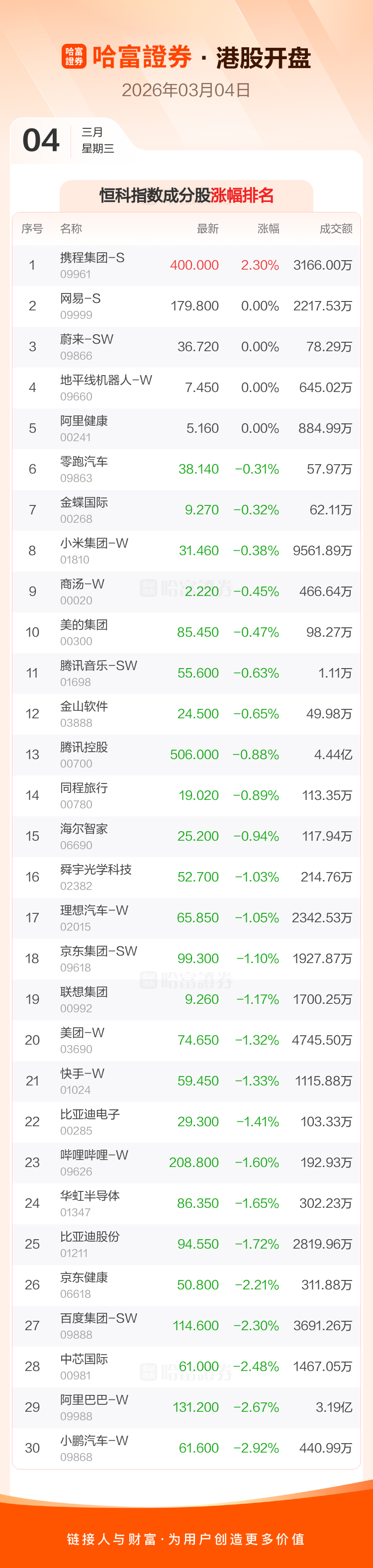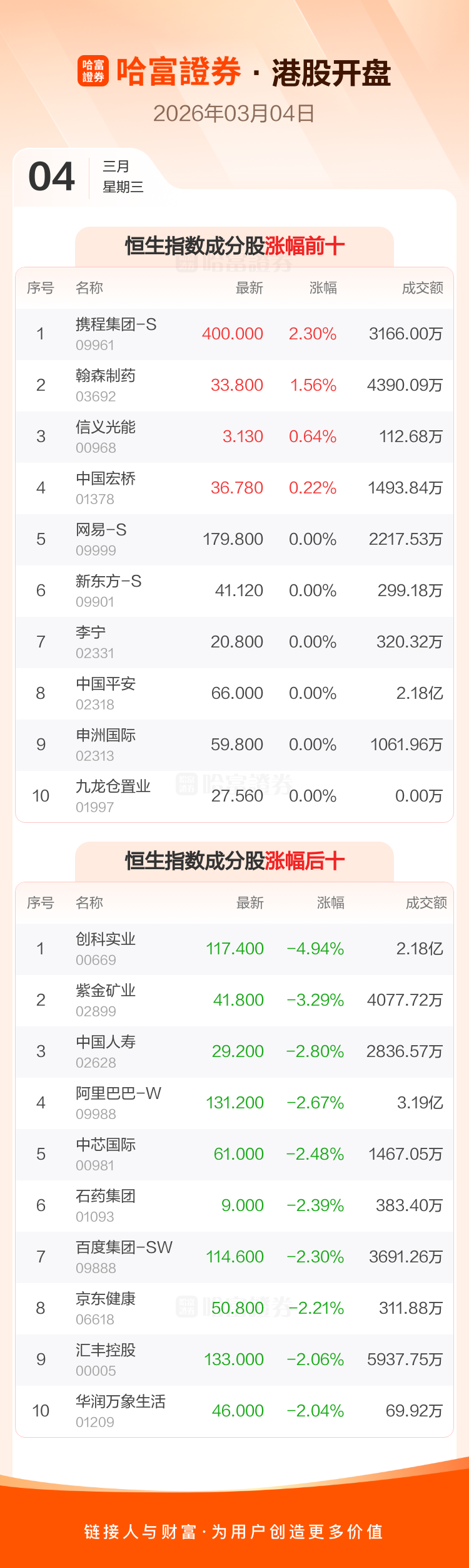 港股3月4日低开 ,恒生指数开盘报25469.34点,跌298.74点,跌幅1.16%;恒生科技指数开盘报4816.2点,跌60.33点,跌幅1.24%。恒生指数成分股中携程集团-S、翰森制药、信义光能涨幅居前,创科实业、紫金矿业、中国人寿跌幅靠前。恒生科技指数成分股中携程集团-S、网易-S、蔚来-SW涨幅居前,小鹏汽车-W、阿里巴巴-W、中芯国际跌幅靠前。