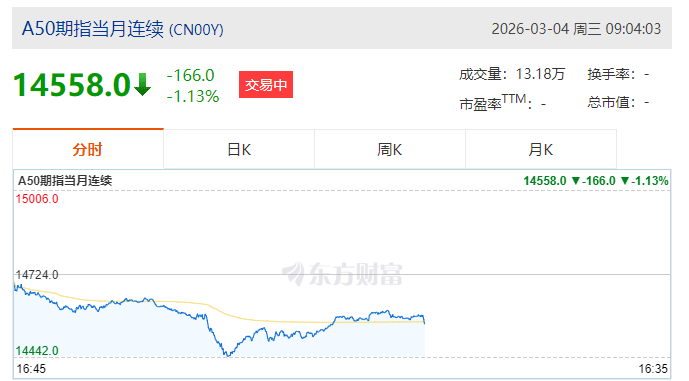 上证报中国证券网讯 3月4日,富时中国A50指数期货在上一个交易日夜盘收跌0.96%的基础上低开。截至9时04分,主力合约跌1.13%。