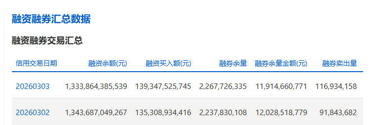 截至3月3日,上交所融资余额报13338.64亿元,较前一交易日减少98.23亿元;深交所融资余额报12914.91亿元,较前一交易日减少126.55亿元;两市合计26253.55亿元,较前一交易日减少224.78亿元。