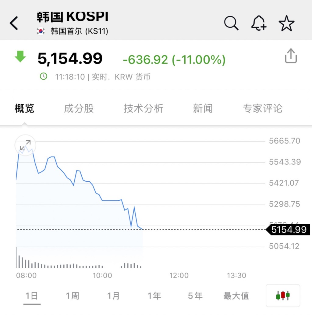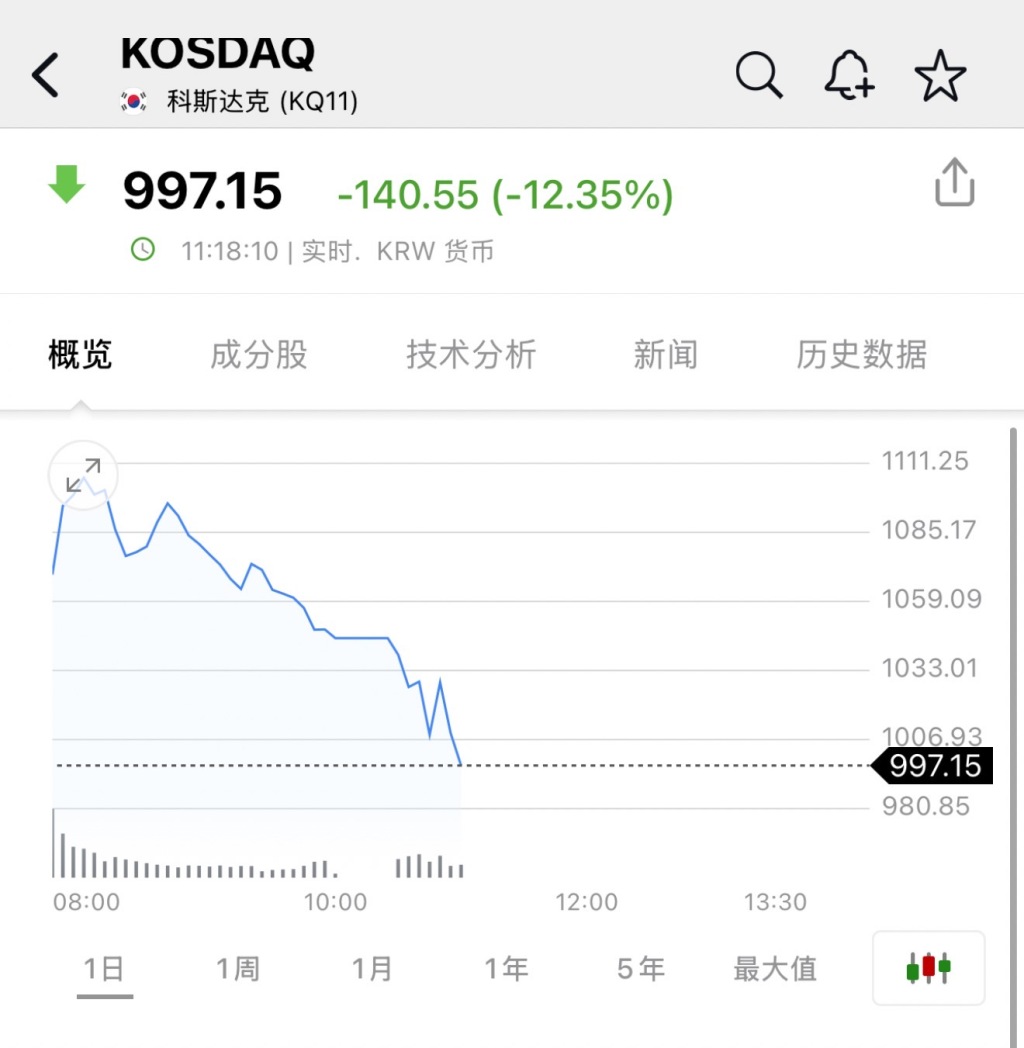 截至发稿前,韩国综指跌幅一度扩大至11%,跌至5154.99点;韩国创业板指数KOSDAQ跌幅达到12.35%,跌至997.15点。