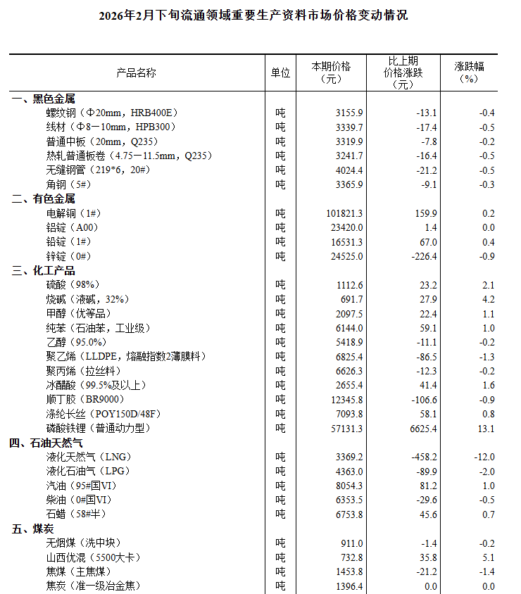 【大河财立方消息】3月4日,国家统计局发布2026年2月下旬流通领域重要生产资料市场价格变动情况。