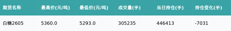 南财智讯3月4日电,盘后期货数据显示,郑州商品交易所的白糖主力合约收跌0.28%,收盘报5308.0元/吨,日内资金流出5185.84万元。其他相关指标见下表: