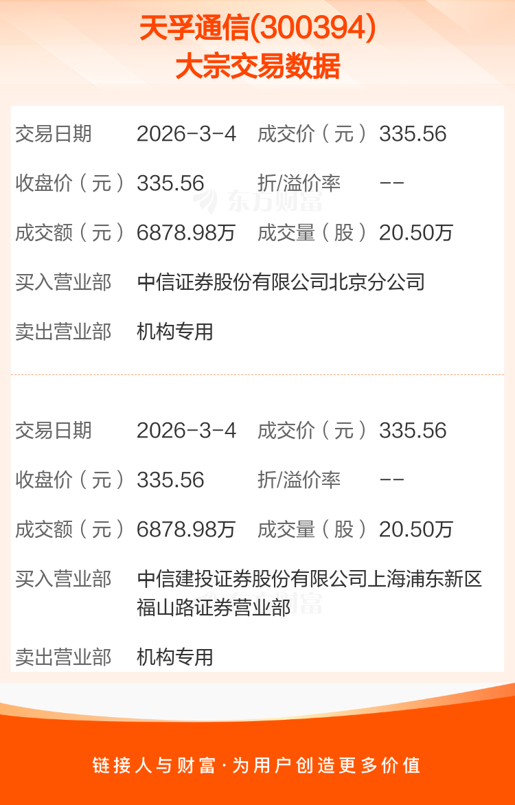 2026年3月4日,天孚通信发生2笔大宗交易,共成交41.00万股,成交金额1.38亿元,占其流通市值比例为0.05%。