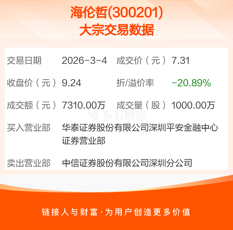 大宗交易:海伦哲成交7310.00万元,折价20.89%(3-4)