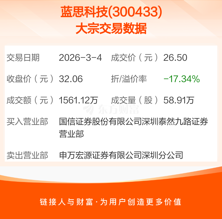 大宗交易:蓝思科技成交1561.12万元,折价17.34%(3-4)