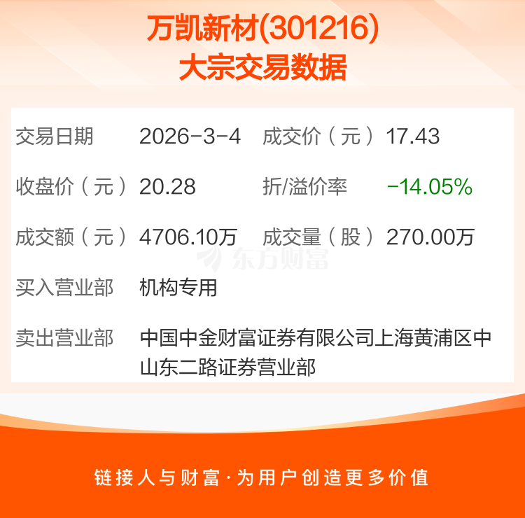 2026年3月4日,万凯新材发生1笔大宗交易,共成交270.00万股,成交金额4706.10万元,占其流通市值比例为0.42%。