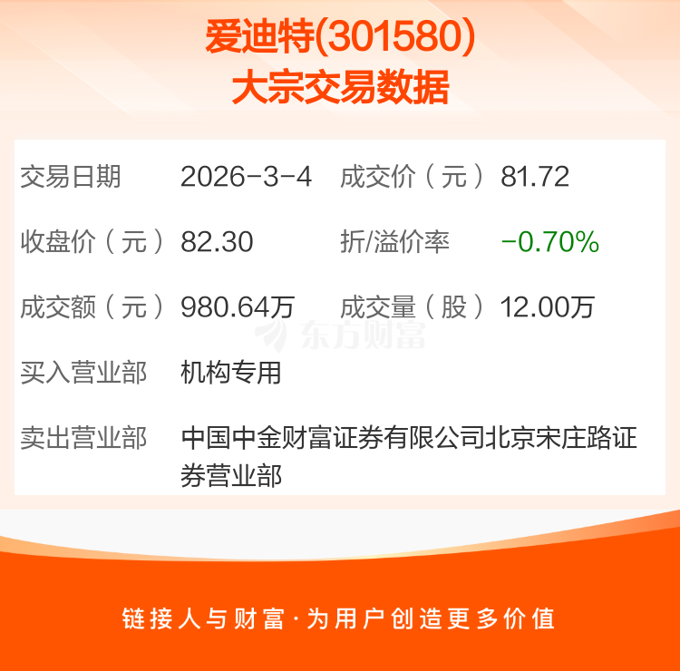 大宗交易:爱迪特成交980.64万元,折价0.70%(3-4)