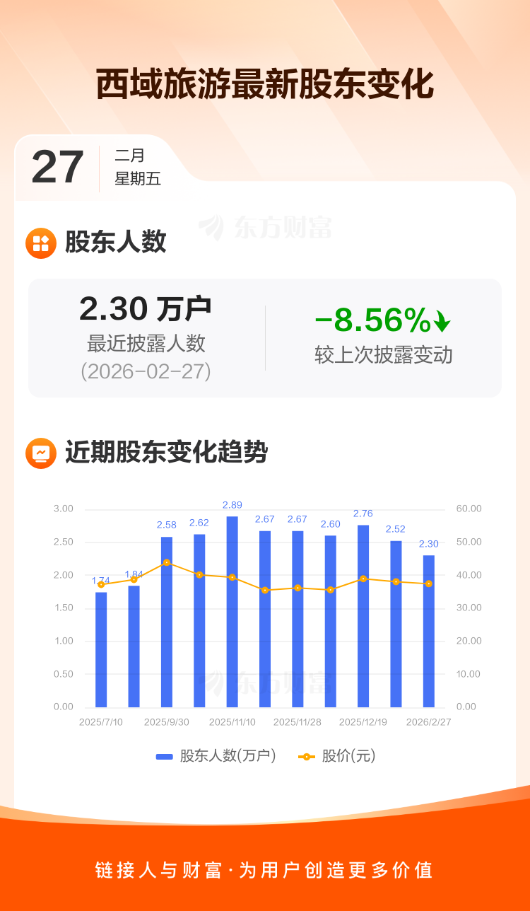 西域旅游:截至2月27日最新股东户数2.30万户,较上期减少8.56%