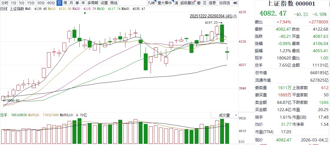 截至收盘,上证指数报收4082.47点,下跌0.98%;深证成指报收13917.75点,下跌0.75%;创业板指报收3164.37点,下跌1.41%。成交量方面,沪深京三市合计成交额达到23882亿元,较前一交易日缩量接近7700亿元。