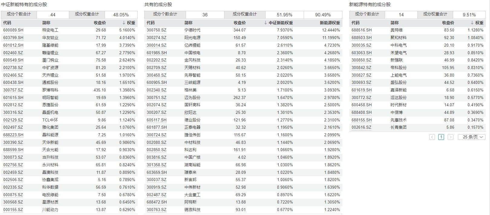 再进一步对比两个指数的成分股,可以发现共有的成分股是36只,中证新能源指数独有的成分股是44只,包括了特变电工、华友钴业、隆基绿能等,中证内地新能源主题指数独有的成分股是14只,包括了奥特维、聚和材料、中科电气等。