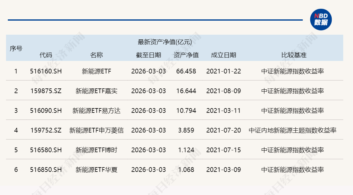 这一期,我们再来对比6只名称均包含“新能源ETF”的产品,具体如下: