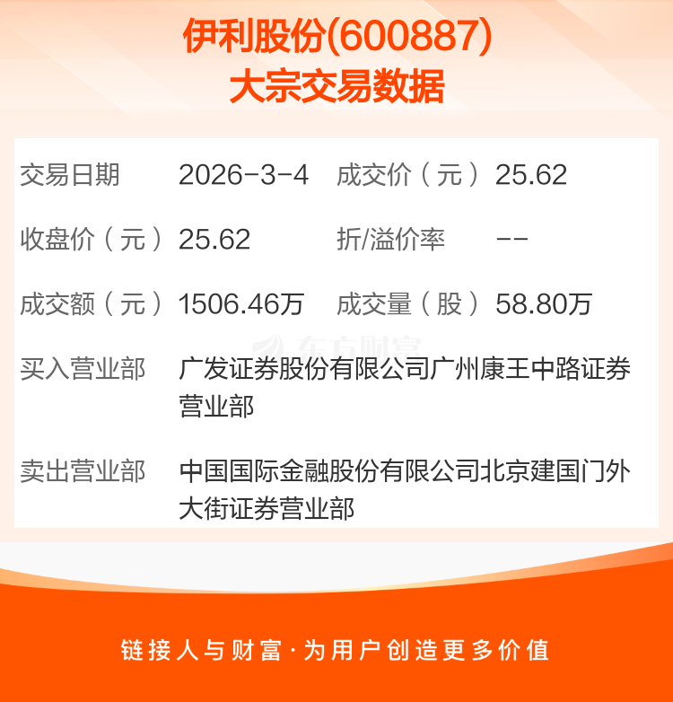 2026年3月4日,伊利股份发生1笔大宗交易,共成交58.80万股,成交金额1506.46万元。