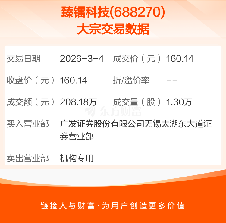 2026年3月4日,臻镭科技发生1笔大宗交易,共成交1.30万股,成交金额208.18万元。