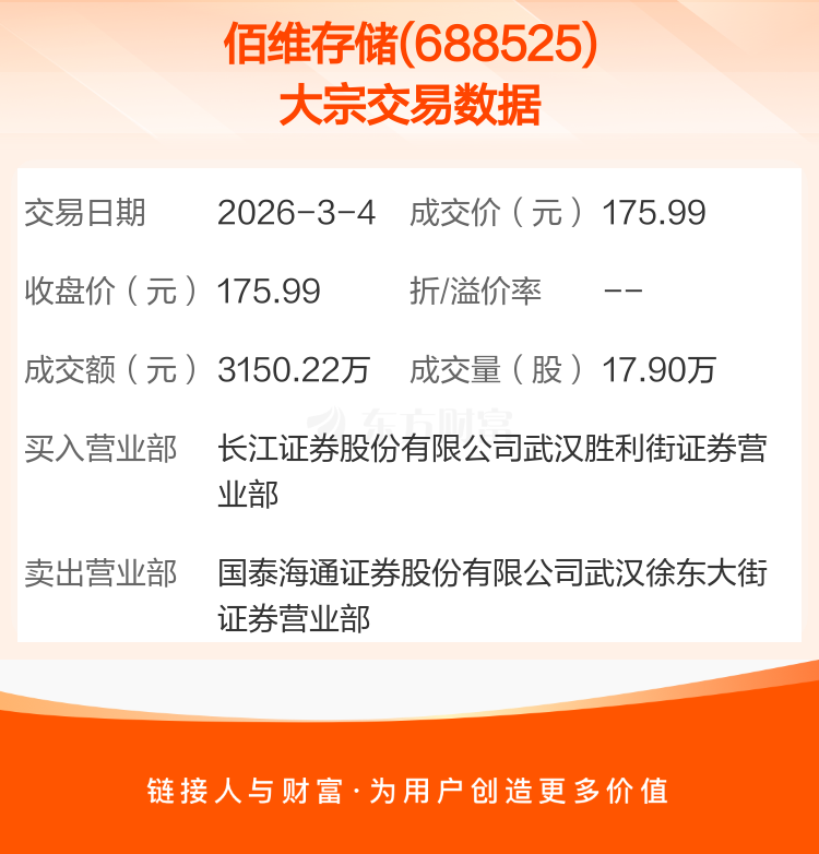 2026年3月4日,佰维存储发生1笔大宗交易,共成交17.90万股,成交金额3150.22万元,占其流通市值比例为0.04%。