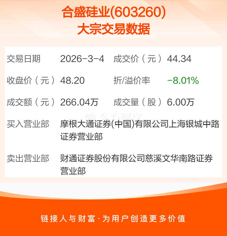 2026年3月4日,合盛硅业发生1笔大宗交易,共成交6.00万股,成交金额266.04万元。
