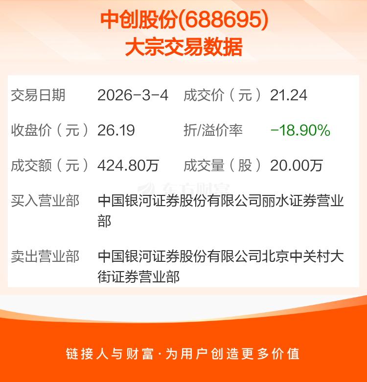 2026年3月4日,中创股份发生1笔大宗交易,共成交20.00万股,成交金额424.80万元,占其流通市值比例为0.32%。