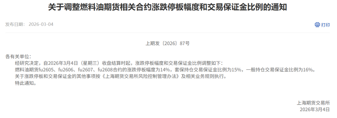 除fu2604合约外,自2026年3月4日(星期三)收盘结算时起,燃料油期货fu2605、fu2606、fu2607、fu2608合约的涨跌停板幅度为14%,套保持仓交易保证金比例为15%,一般持仓交易保证金比例为16%。