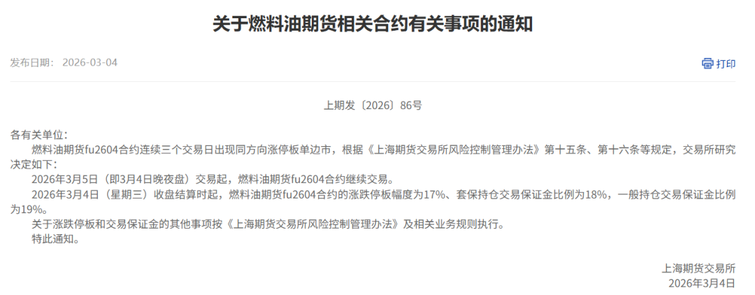2026年3月4日(星期三)收盘结算时起,燃料油期货fu2604合约的涨跌停板幅度为17%、套保持仓交易保证金比例为18%,一般持仓交易保证金比例为19%。
