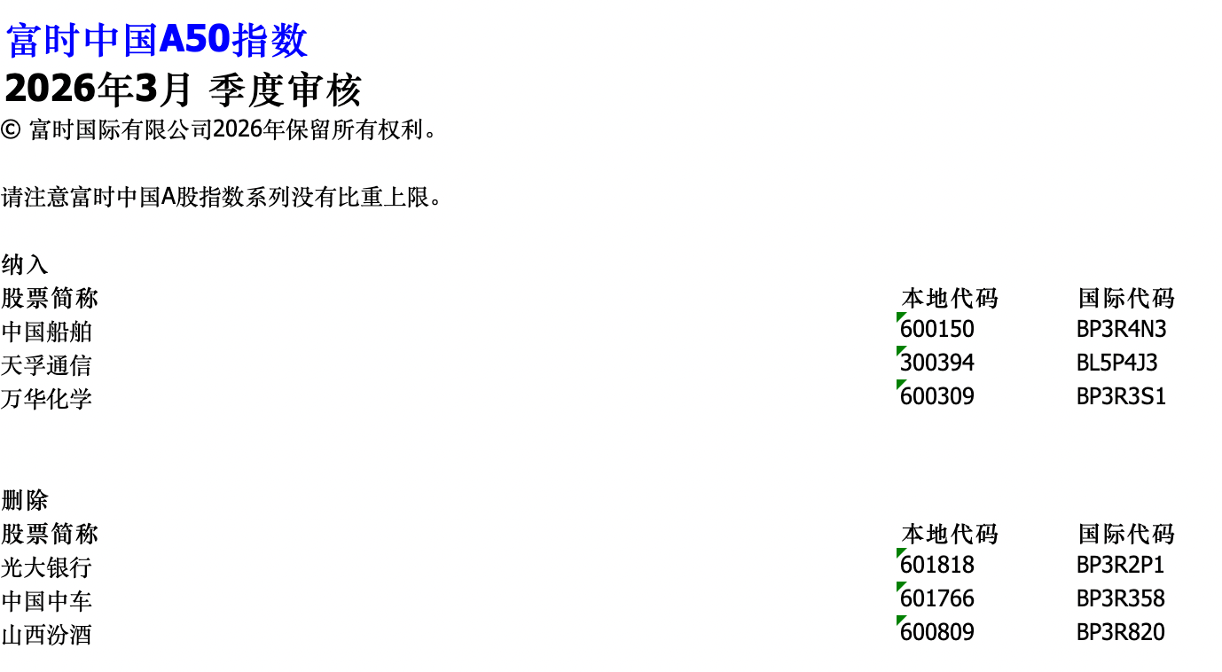 3月4日,富时罗素公布2026年3月富时中国50指数、富时中国A50指数、富时中国A150指数、富时中国A200指数以及富时中国A400指数季检结果, 3月20日星期五收盘后(即3月23日星期一)生效。