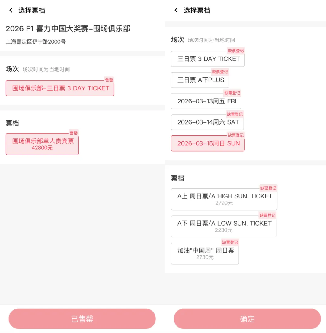 自2025年12月11日上午11时正式开票以来,赛事的票房就展现了惊人的爆发力。从开票至今已过去3个月,蓝鲸记者查询发现,截至发稿,2026赛季F1中国大奖赛所有类别的门票已全部售罄。其中,包含高达42800元的围场票及12900元的铂金票在内,各档位均显示无余票。