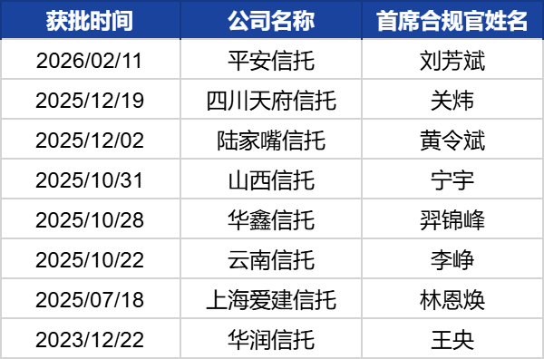 记者注意到,2025年10月以来进入首席合规官的密集获批期,云南信托、华鑫信托、山西信托、陆家嘴信托、天府信托等多家信托公司首席合规官的任职资格获监管核准。