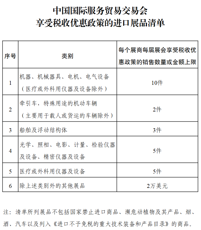 一、对服贸会每个展商在展期内销售的免税额度内的进口展品,免征进口关税、进口环节增值税和消费税。享受税收优惠政策的展品类别和销售额度等规定见附件。