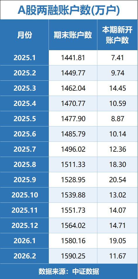 中证数据最新数据显示,2月市场新开两融账户11.7万户,受春节假期影响环比1月下降38.6%,但同比仍增长20%,杠杆资金入市意愿积极。截至2月末,全市场两融账户总数达1590.25万户。