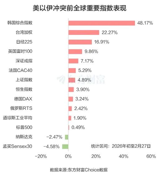 东方财富Choice数据显示,美以伊冲突于2月28日爆发,而2026年初至2月27日,韩国综合指数大涨48.17%,在全球重要股指中遥遥领先。台湾加权、日经225紧随其后,分别上涨22.27%、16.91%。