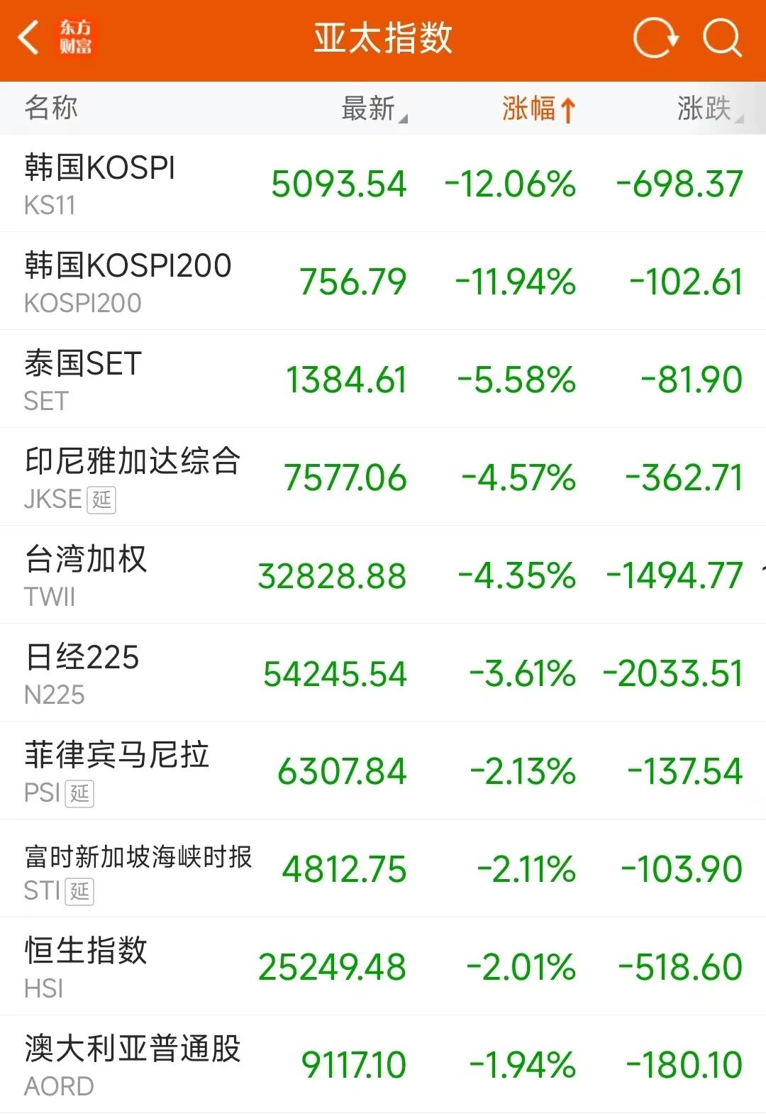亚洲股市3月4日恐慌情绪更甚,韩国综合指数盘中触发熔断,收盘大跌12.06%,近两天跌幅18.43%,抹去近一个月涨幅;泰国SET暴跌8.01%,触发停牌,收盘大跌5.58%。此外,印尼雅加达综合下跌4.57%、台湾加权下跌4.35%、日经225下跌3.61%。
