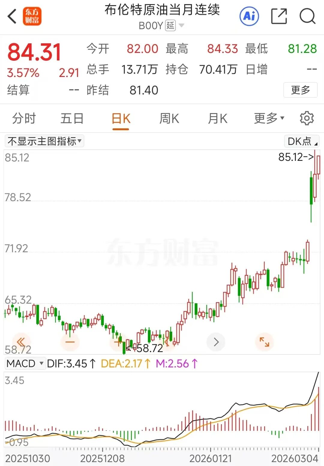 布伦特原油3月4日继续走强,截稿时涨幅超3%,突破84美元/桶。至此,布伦特原油本周累计涨幅超过15%。