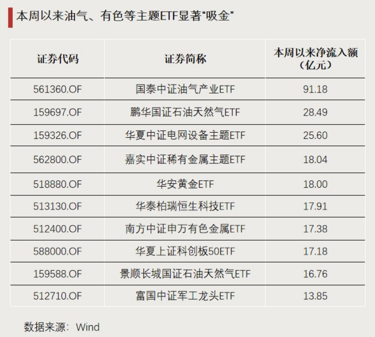 受国际油价、部分金属价格拉涨推动,本周以来,油气、有色等资源类ETF显著吸金。截至3月3日,本周以来国泰中证油气产业ETF大幅“吸金”91.18亿元,位列ETF市场第一。