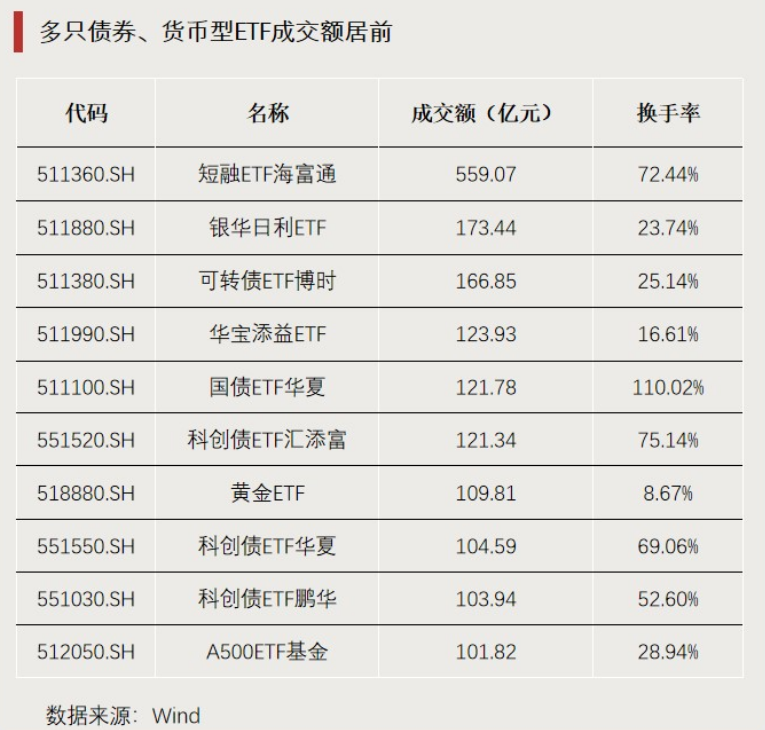 今天成交额排名前十位的ETF产品,有8只为货币型或债券型ETF。短融ETF海富通全天成交金额接近560亿元,银华日利ETF、可转债ETF博时、华宝添益ETF等品种成交金额均超过100亿元。
