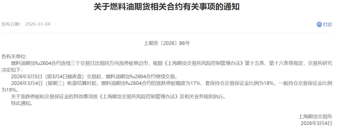另外,燃料油期货fu2604合约连续三个交易日出现同方向涨停板单边市,根据《上海期货交易所风险控制管理办法》第十五条、第十六条等规定,上期所研究决定,2026年3月5日(即3月4日夜盘)交易起,燃料油期货fu2604合约继续交易。2026年3月4日收盘结算时起,燃料油期货fu2604合约的涨跌停板幅度为17%,套保持仓交易保证金比例为18%,一般持仓交易保证金比例为19%。