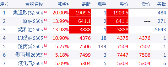 同日,上海国际能源交易中心发布通知,自2026年3月4日收盘结算时起,原油期货sc2604、sc2605、sc2606合约涨跌停板幅度为14%,套保持仓交易保证金比例为15%,一般持仓交易保证金比例为16%。低硫燃料油期货lu2605合约的涨跌停板幅度为14%,套保持仓交易保证金比例为15%,一般持仓交易保证金比例为16%。低硫燃料油期货lu2607合约的涨跌停板幅度为12%,套保持仓交易保证金比例为13%,一般持仓交易保证金比例为14%。集运指数(欧线)期货ec2604、ec2605、ec2606、ec2607、ec2608、ec2609、ec2612合约的涨跌停板幅度为20%,套保持仓交易保证金比例为22%,一般持仓交易保证金比例为22%。集运指数(欧线)期货ec2610合约的涨跌停板幅度为18%,套保持仓交易保证金比例为20%,一般持仓交易保证金比例为20%。
