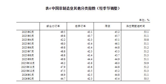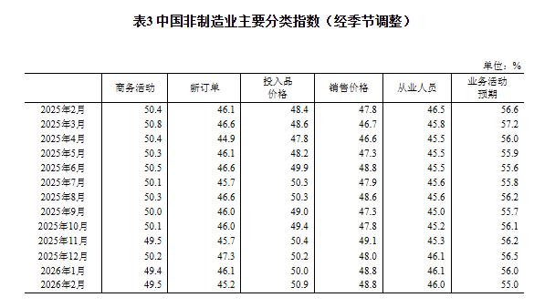 中新网3月4日电据国家统计局网站消息,国家统计局服务业调查中心、中国物流与采购联合会发布2026年2月中国采购经理指数运行情况。