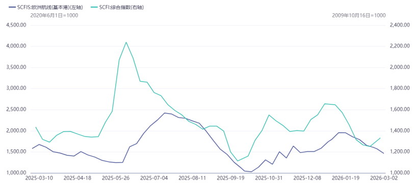 图为SCFIS欧线基本港、SCFI综合指数