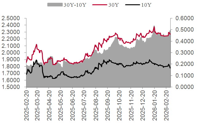 图为30年期和10年期国债收益率以及利差走势(单位:%)