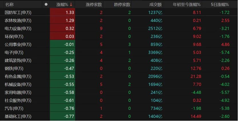 国防军工、农林牧渔、电力设备、环保板块收红。个股方面,航天彩虹、农发种业、亚盛集团等涨停。